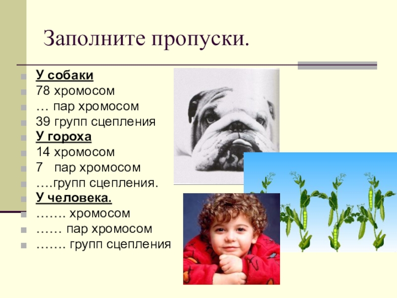Заполните пропуски.У собаки78 хромосом… пар хромосом39 групп сцепления У гороха14 хромосом7  пар хромосом….групп сцепления.У человека.……. хромосом……