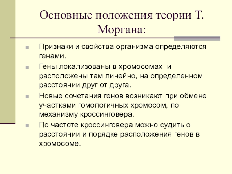 Основные положения теории Т.Моргана: Признаки и свойства организма определяются генами.Гены локализованы в хромосомах и расположены там линейно,