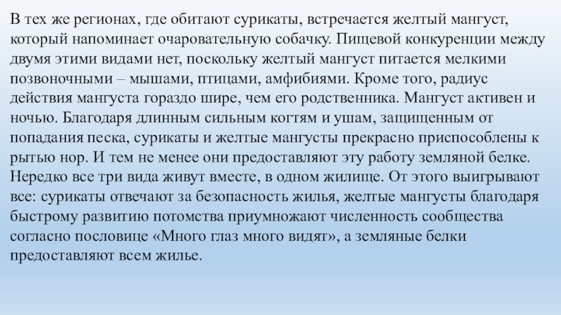 Слайд 12В тех же регионах, где обитают сурикаты, встречается желтый мангуст, который