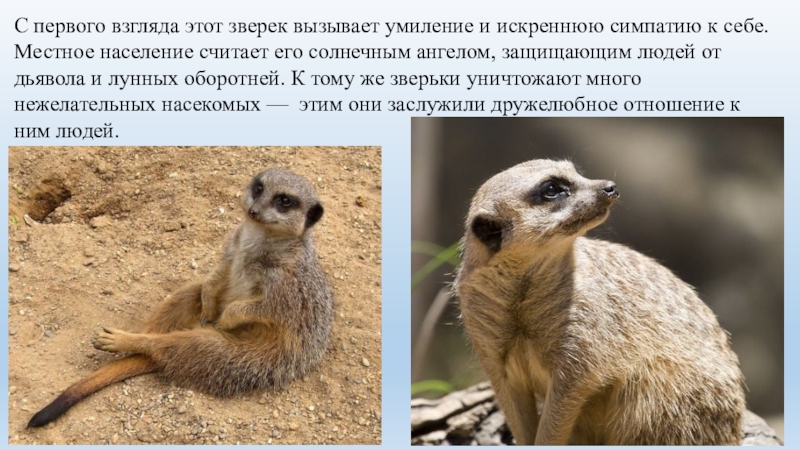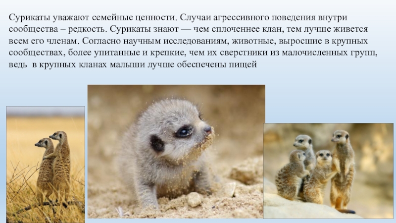 Слайд 8Сурикаты уважают семейные ценности. Случаи агрессивного поведения внутри сообщества – редкость.