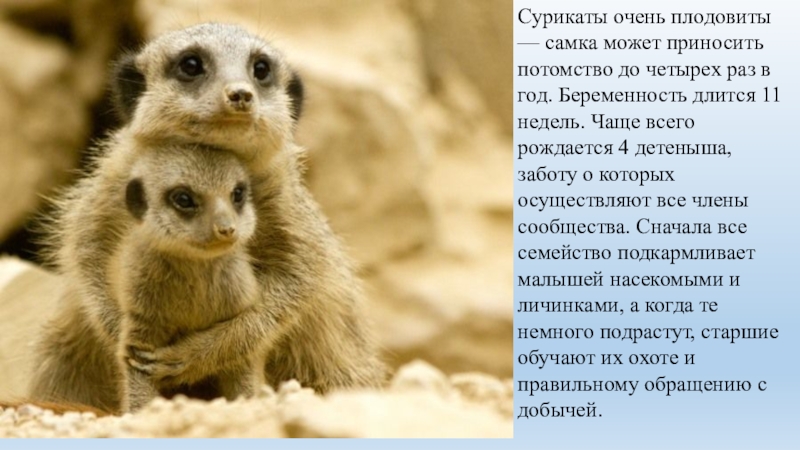 Слайд 6Сурикаты очень плодовиты — самка может приносить потомство до четырех раз