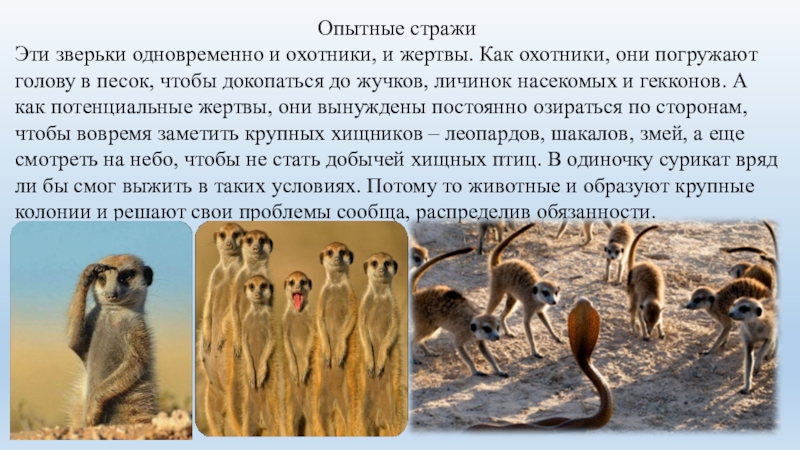 погружают голову в песок, чтобы докопаться до жучков, личинок насекомых и гекконов. А как потенциальные жертвы, они вынуждены постоянно озираться по сторонам, чтобы вовремя заметить крупных хищников – леопардов, шакалов, змей, а еще смотреть на небо, чтобы не стать добычей хищных птиц. В одиночку сурикат вряд ли бы смог выжить в таких условиях. Потому то животные и образуют крупные колонии и решают свои проблемы сообща, распределив обязанности.