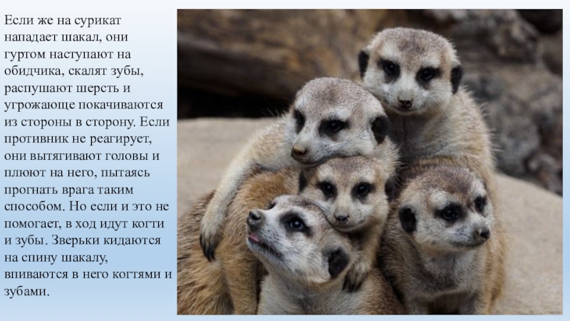Слайд 11Если же на сурикат нападает шакал, они гуртом наступают на обидчика,