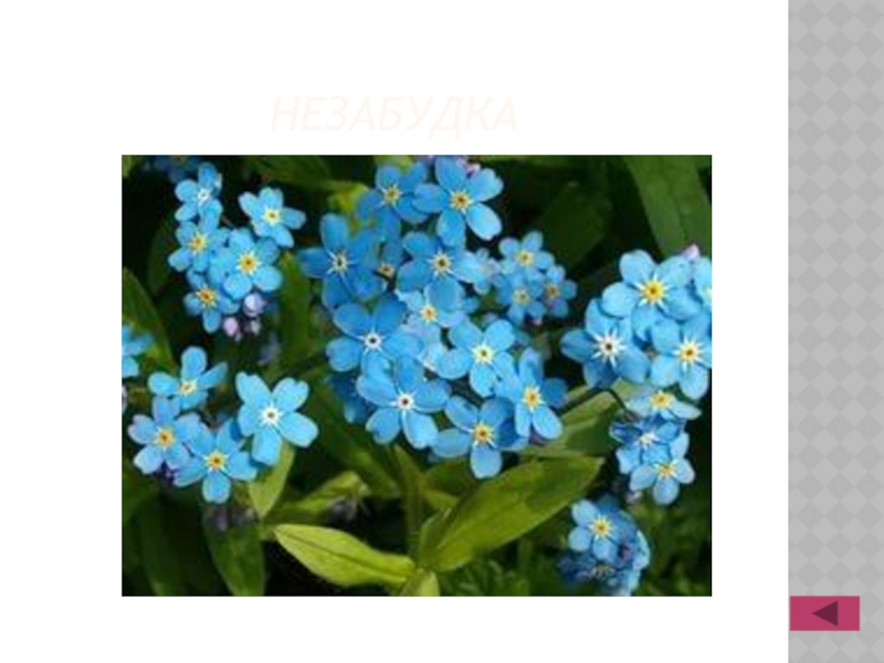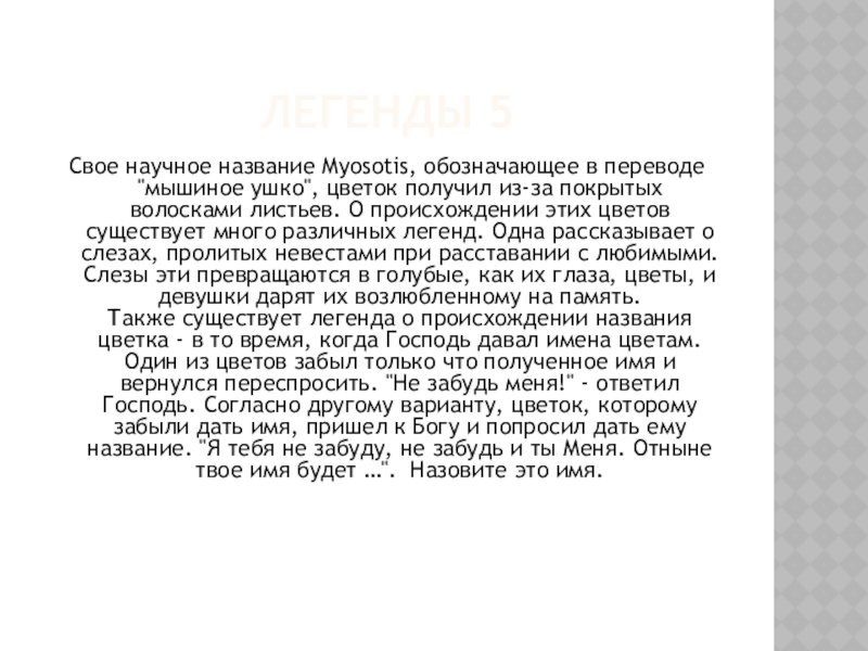 Также существует легенда о происхождении названия цветка - в то время, когда Господь давал имена цветам. Один из цветов забыл только что полученное имя и вернулся переспросить. "Не забудь меня!" - ответил Господь. Согласно другому варианту, цветок, которому забыли дать имя, пришел к Богу и попросил дать ему название. "Я тебя не забуду, не забудь и ты Меня. Отныне твое имя будет …". Назовите это имя.