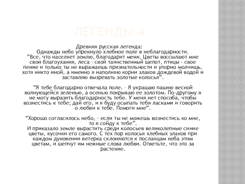 И приказало земле вырастить среди колосьев великолепные синие цветы, кусочки его самого. С тех пор колосья хлебных злаков при каждом дуновении ветерка склоняются к посланцам неба этим цветам, и шепчут им нежные слова любви. Ответьте, что это за растение.