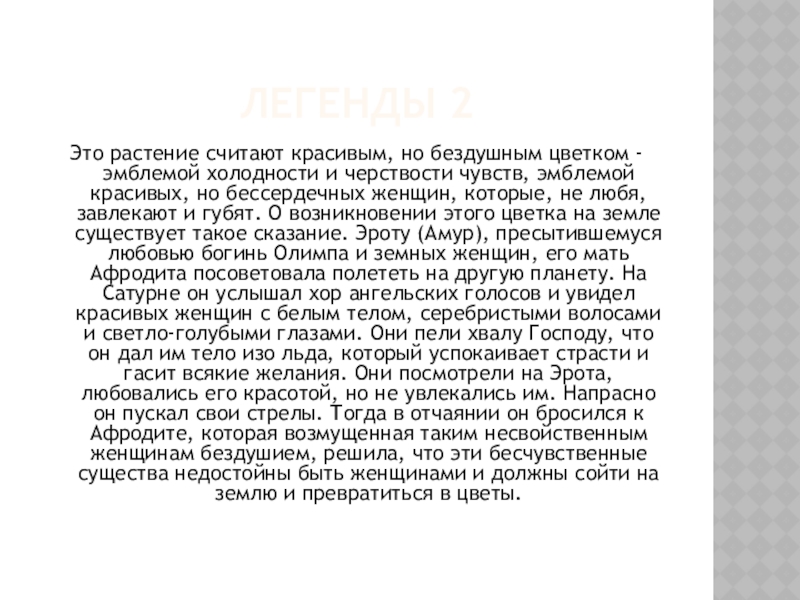 и черствости чувств, эмблемой красивых, но бессердечных женщин, которые, не любя, завлекают и губят. О возникновении этого цветка на земле существует такое сказание. Эроту (Амур), пресытившемуся любовью богинь Олимпа и земных женщин, его мать Афродита посоветовала полететь на другую планету. На Сатурне он услышал хор ангельских голосов и увидел красивых женщин с белым телом, серебристыми волосами и светло-голубыми глазами. Они пели хвалу Господу, что он дал им тело изо льда, который успокаивает страсти и гасит всякие желания. Они посмотрели на Эрота, любовались его красотой, но не увлекались им. Напрасно он пускал свои стрелы. Тогда в отчаянии он бросился к Афродите, которая возмущенная таким несвойственным женщинам бездушием, решила, что эти бесчувственные существа недостойны быть женщинами и должны сойти на землю и превратиться в цветы.