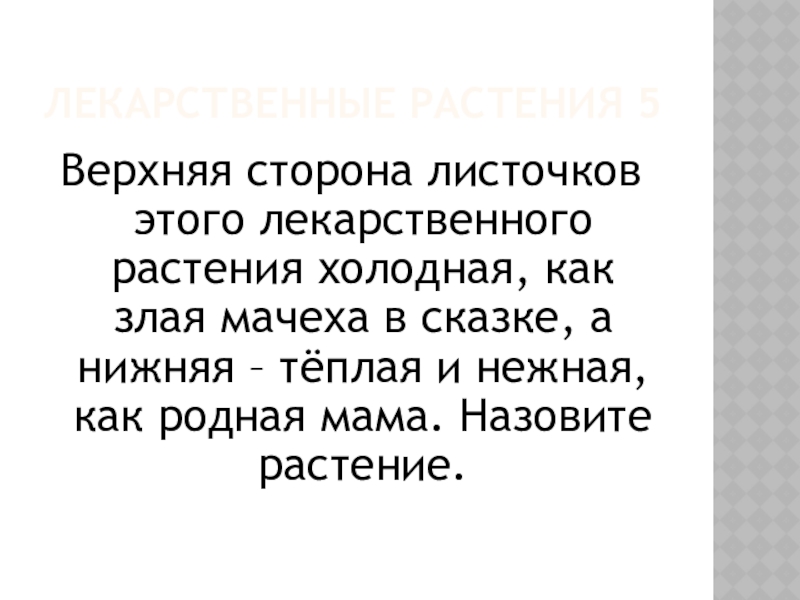мачеха в сказке, а нижняя – тёплая и нежная, как родная мама. Назовите растение.