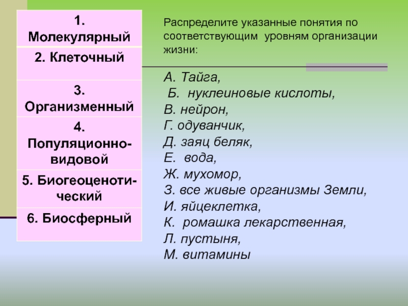 1 –Б,Е,М. 2- В,И. 3- Г,Ж. 4- Д,К. 5- А,Л. 6 -З.