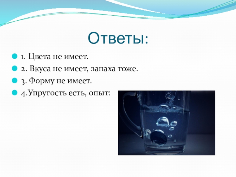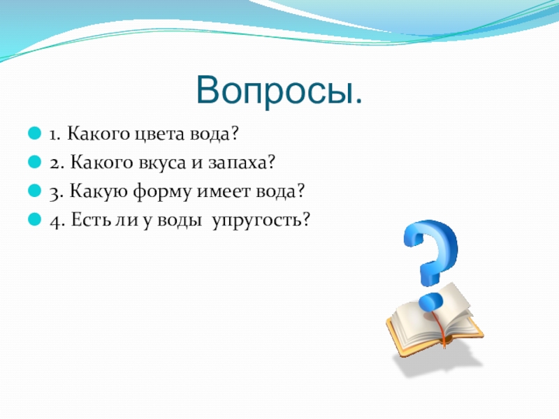 Вопросы.1. Какого цвета вода?2. Какого вкуса и запаха?3. Какую форму имеет вода?4. Есть ли у воды упругость?