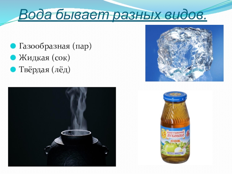 Вода бывает разных видов.Газообразная (пар)Жидкая (сок)Твёрдая (лёд)