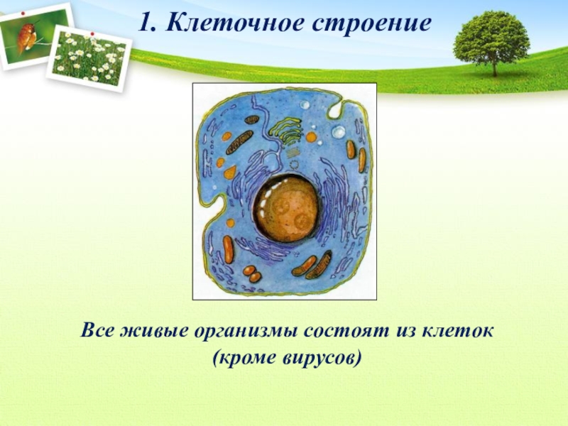1. Клеточное строениеВсе живые организмы состоят из клеток (кроме вирусов)