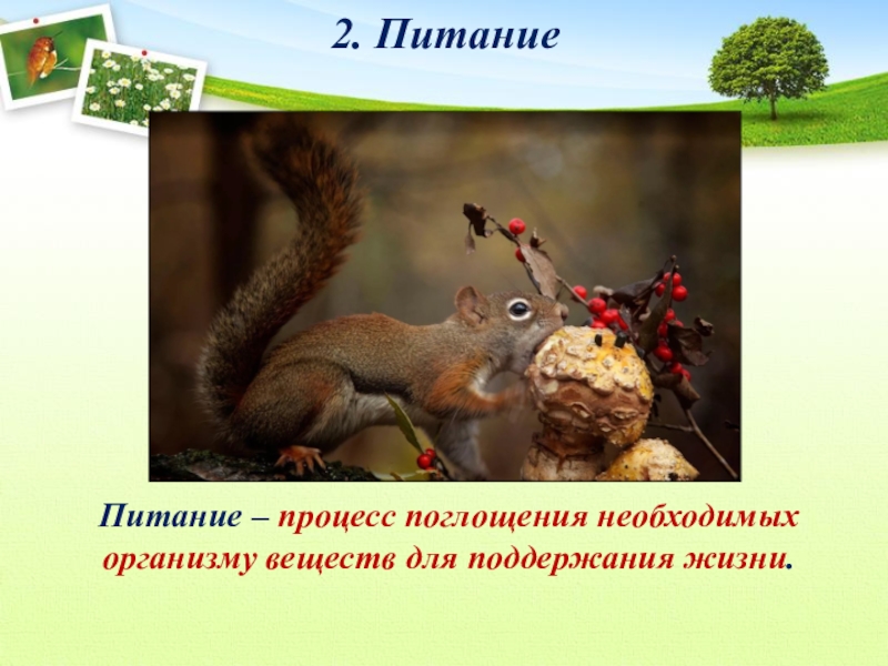 2. ПитаниеПитание – процесс поглощения необходимых организму веществ для поддержания жизни.