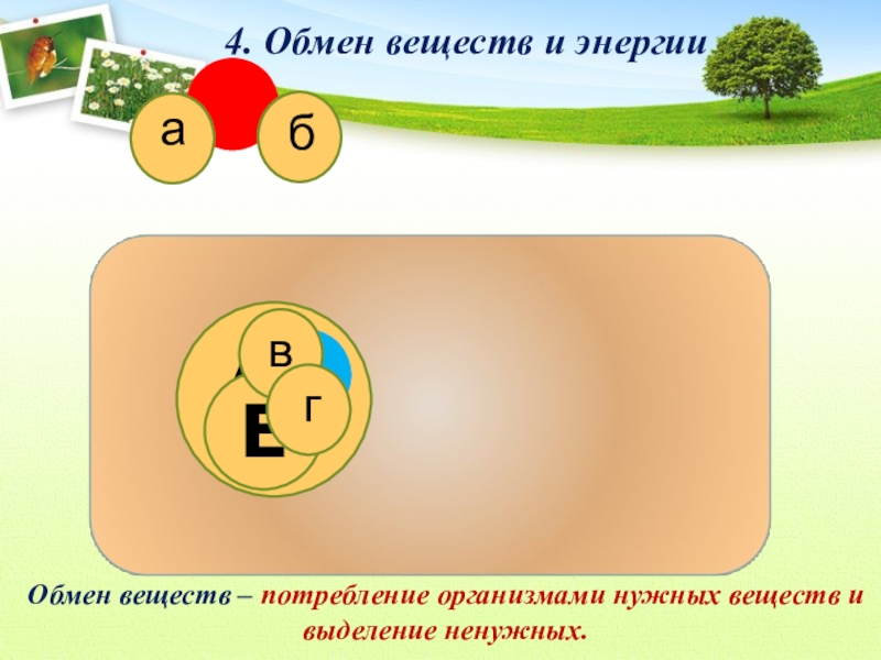 4. Обмен веществ и энергииЕОбмен веществ – потребление организмами нужных веществ и выделение ненужных.