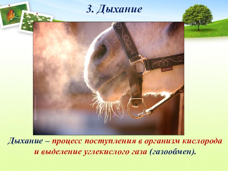 3. ДыханиеДыхание – процесс поступления в организм кислорода и выделение углекислого газа (газообмен).
