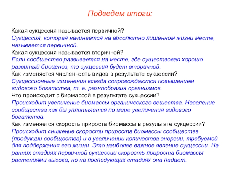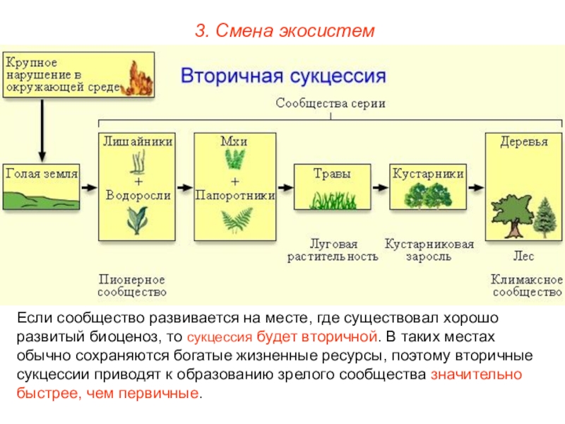 биоценоз, то сукцессия будет вторичной. В таких местах обычно сохраняются богатые жизненные ресурсы, поэтому вторичные сукцессии приводят к образованию зрелого сообщества значительно быстрее, чем первичные.