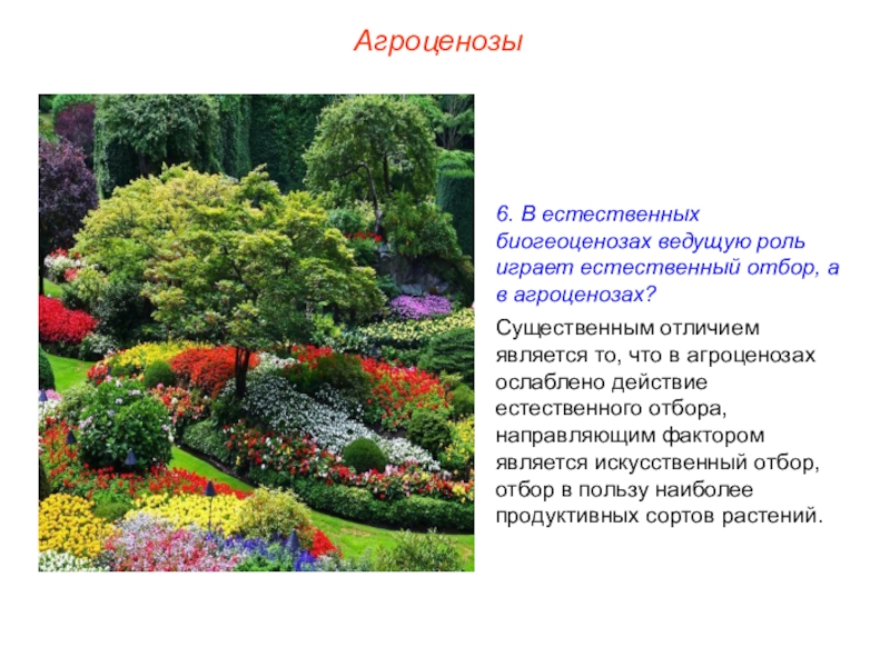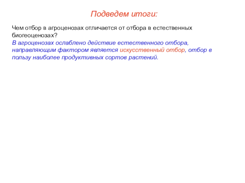 агроценозах ослаблено действие естественного отбора, направляющим фактором является искусственный отбор, отбор в пользу наиболее продуктивных сортов растений.