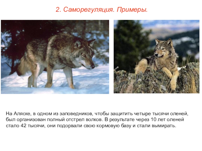 тысячи оленей, был организован полный отстрел волков. В результате через 10 лет оленей стало 42 тысячи, они подорвали свою кормовую базу и стали вымирать.