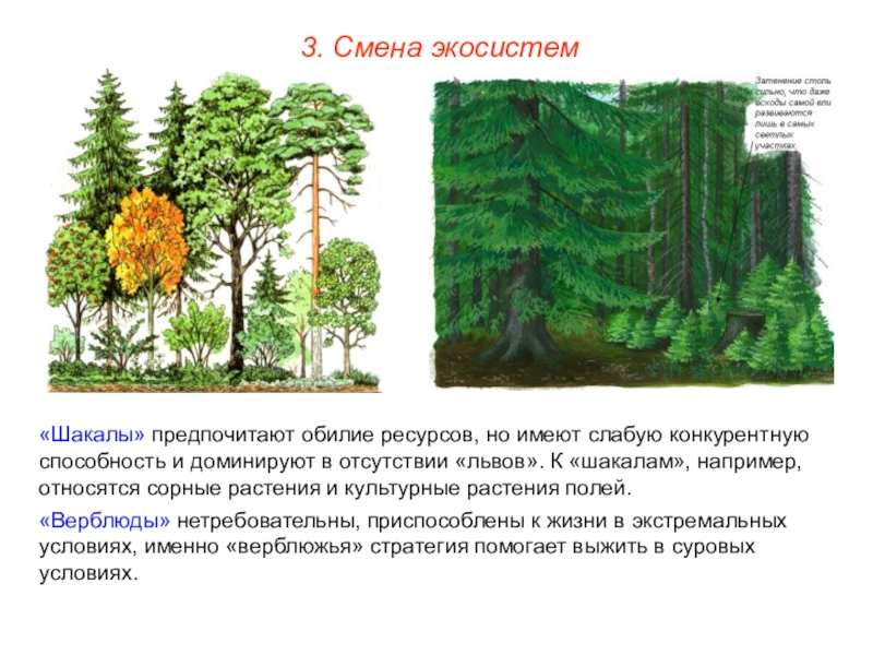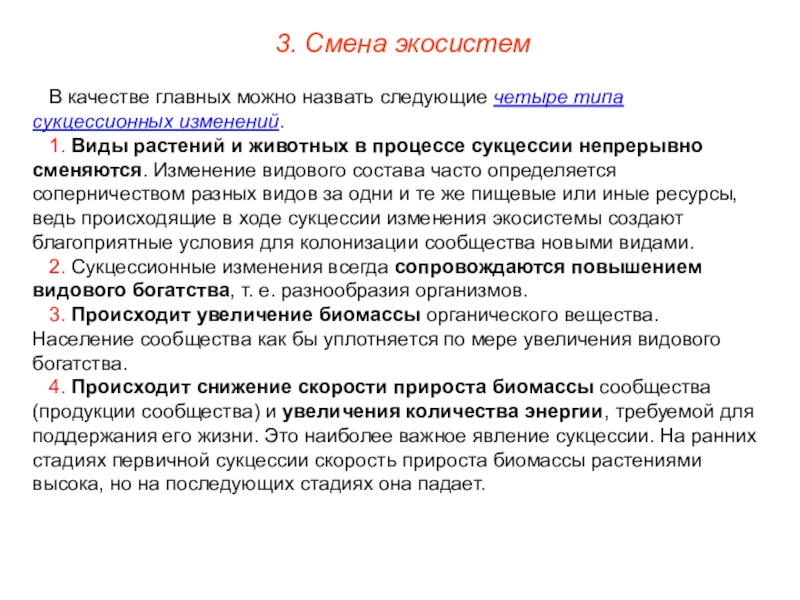 1. Виды растений и животных в процессе сукцессии непрерывно сменяются. Изменение видового состава часто определяется соперничеством разных видов за одни и те же пищевые или иные ресурсы, ведь происходящие в ходе сукцессии изменения экосистемы создают благоприятные условия для колонизации сообщества новыми видами.