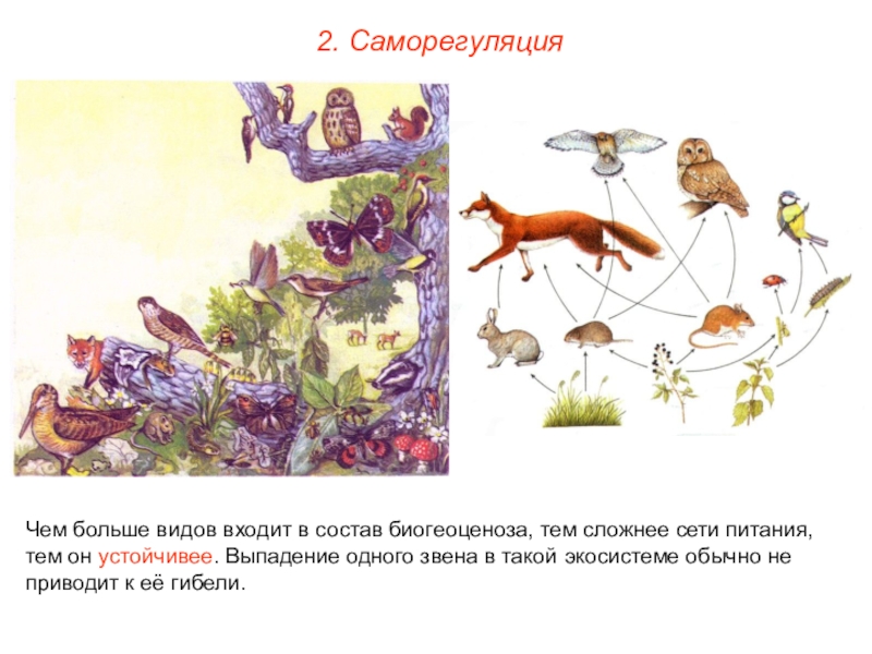 Чем больше видов входит в состав биогеоценоза, тем сложнее сети питания, тем он устойчивее. Выпадение одного звена в такой экосистеме обычно не приводит к её гибели.
