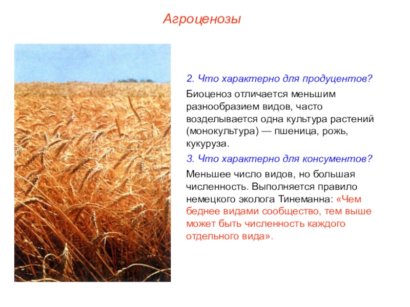 Биоценоз отличается меньшим разнообразием видов, часто возделывается одна культура растений (монокультура) — пшеница, рожь, кукуруза.
