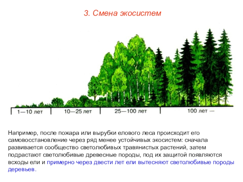 самовосстановление через ряд менее устойчивых экосистем: сначала развивается сообщество светолюбивых травянистых растений, затем подрастают светолюбивые древесные породы, под их защитой появляются всходы ели и примерно через двести лет ели вытесняют светолюбивые породы деревьев.