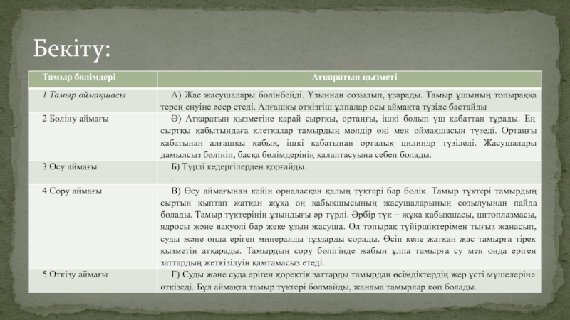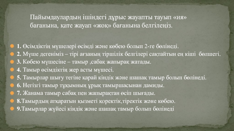 Пайымдаулардың ішіндегі дұрыс жауапты тауып «ия» бағанына, қате жауап «жоқ» бағанына белгілеңіз.
