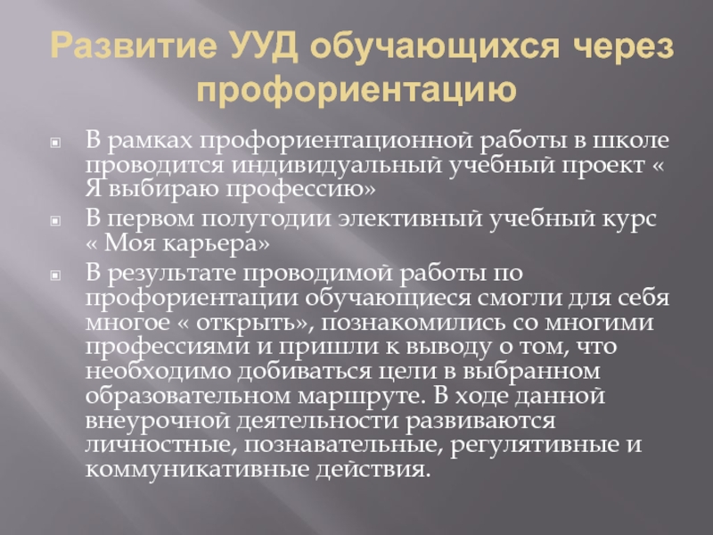 Слайд 14Развитие УУД обучающихся через профориентацию