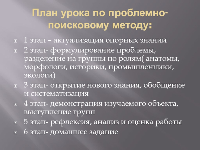 формулирование проблемы, разделение на группы по ролям( анатомы, морфологи, историки, промышленники, экологи)