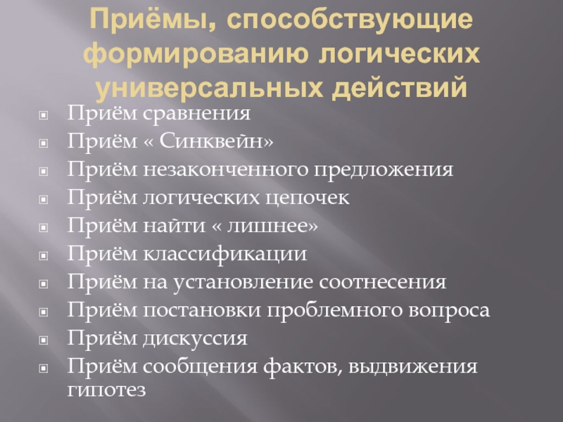 Слайд 10Приёмы, способствующие формированию логических универсальных действий