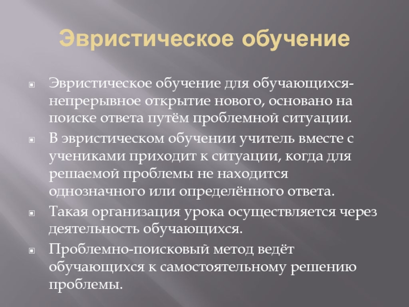 В эвристическом обучении учитель вместе с учениками приходит к ситуации, когда для решаемой проблемы не находится однозначного или определённого ответа.