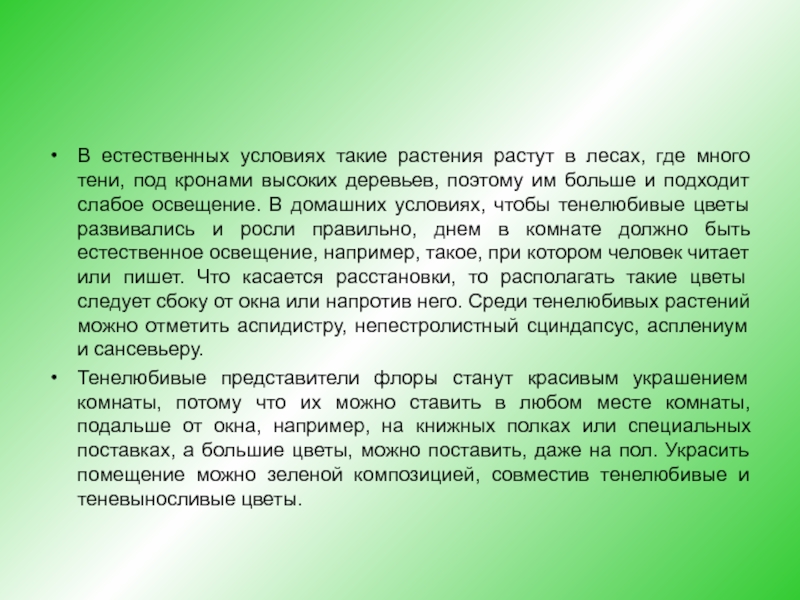 под кронами высоких деревьев, поэтому им больше и подходит слабое освещение. В домашних условиях, чтобы тенелюбивые цветы развивались и росли правильно, днем в комнате должно быть естественное освещение, например, такое, при котором человек читает или пишет. Что касается расстановки, то располагать такие цветы следует сбоку от окна или напротив него. Среди тенелюбивых растений можно отметить аспидистру, непестролистный сциндапсус, асплениум и сансевьеру.
