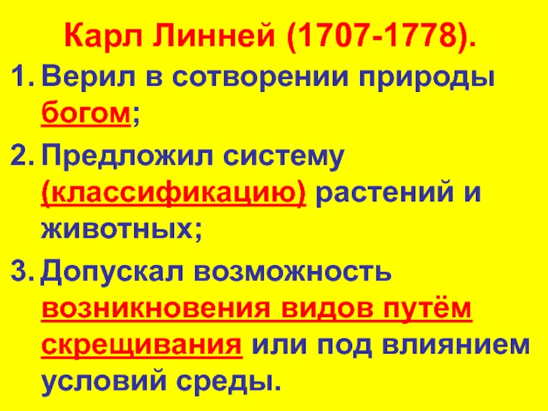 Карл Линней (1707-1778).Верил в сотворении природы богом;Предложил систему (классификацию) растений и животных;Допускал возможность возникновения видов путём скрещивания
