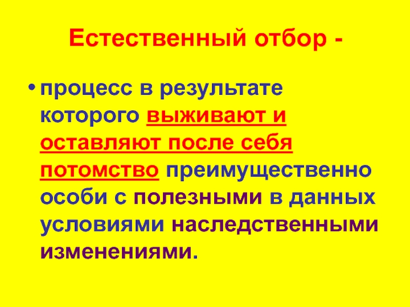 Естественный отбор - процесс в результате которого выживают и оставляют после себя потомство преимущественно особи с полезными