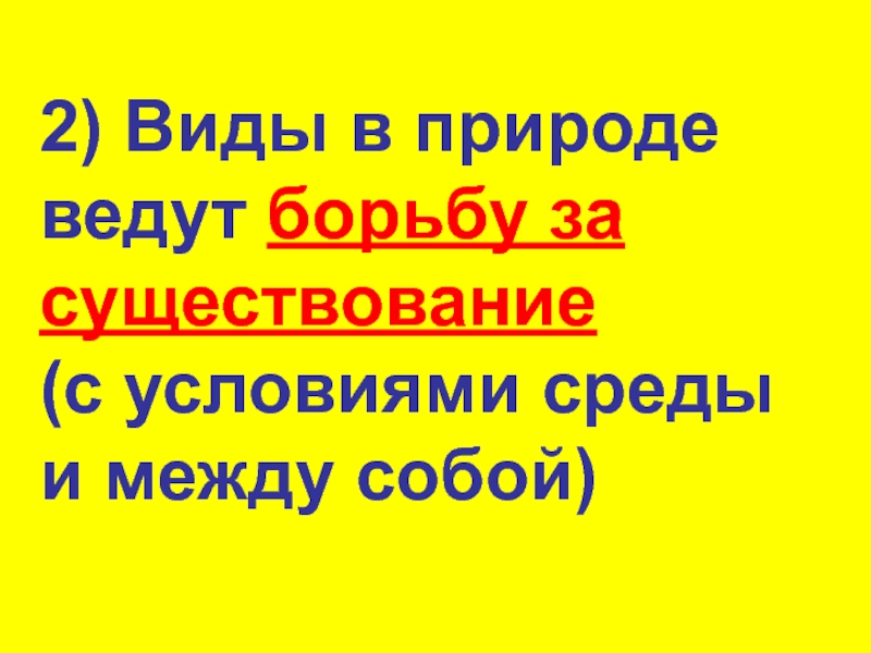 2) Виды в природе ведут борьбу за существование (с условиями среды и между собой)