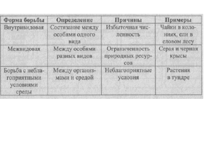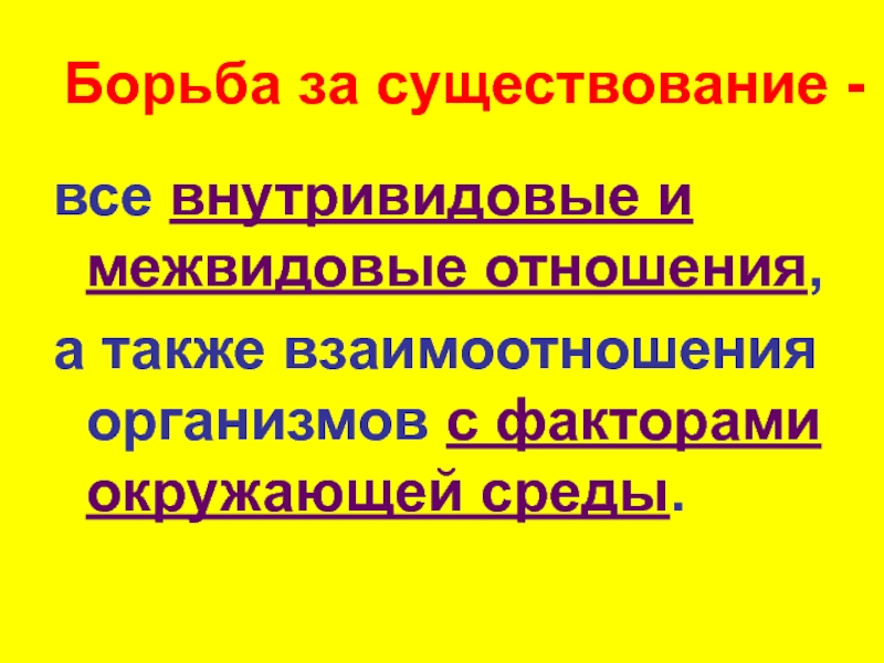 Борьба за существование -все внутривидовые и межвидовые отношения,а также взаимоотношения организмов с факторами окружающей среды.