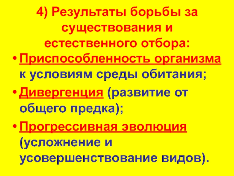 4) Результаты борьбы за существования и естественного отбора:Приспособленность организма к условиям среды обитания;Дивергенция (развитие от общего предка);Прогрессивная