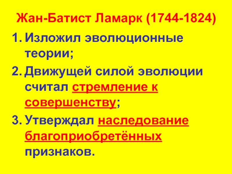 Жан-Батист Ламарк (1744-1824)Изложил эволюционные теории;Движущей силой эволюции считал стремление к совершенству;Утверждал наследование благоприобретённых признаков.