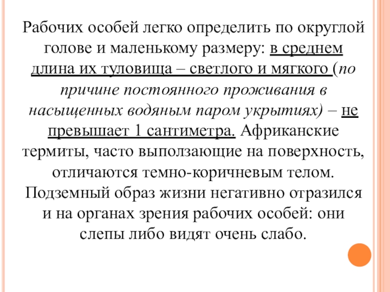 среднем длина их туловища – светлого и мягкого (по причине постоянного проживания в насыщенных водяным паром укрытиях) – не превышает 1 сантиметра. Африканские термиты, часто выползающие на поверхность, отличаются темно-коричневым телом. Подземный образ жизни негативно отразился и на органах зрения рабочих особей: они слепы либо видят очень слабо.