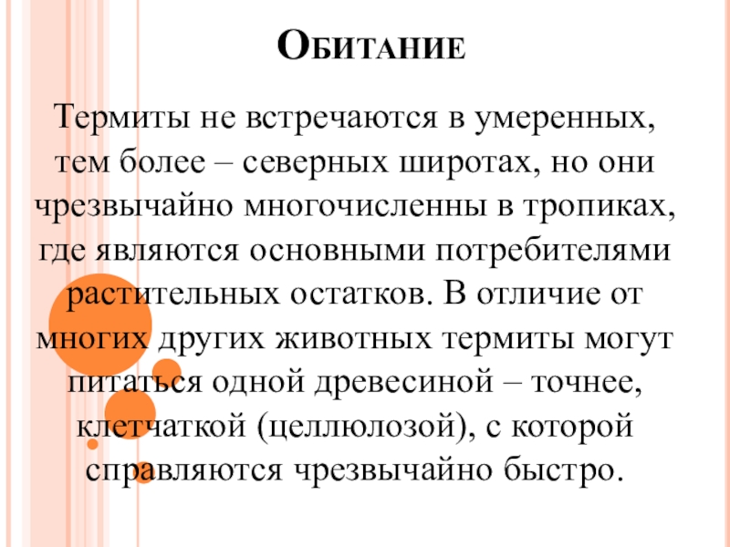 они чрезвычайно многочисленны в тропиках, где являются основными потребителями растительных остатков. В отличие от многих других животных термиты могут питаться одной древесиной – точнее, клетчаткой (целлюлозой), с которой справляются чрезвычайно быстро.
