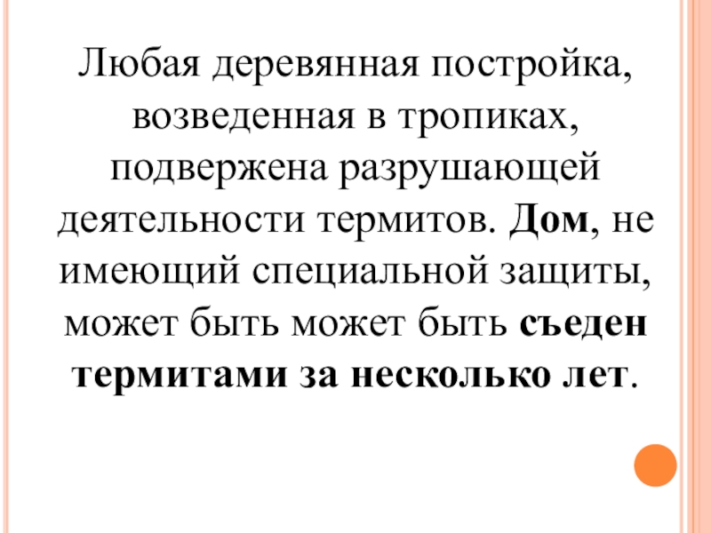Слайд 21Любая деревянная постройка, возведенная в тропиках, подвержена разрушающей деятельности термитов. Дом,