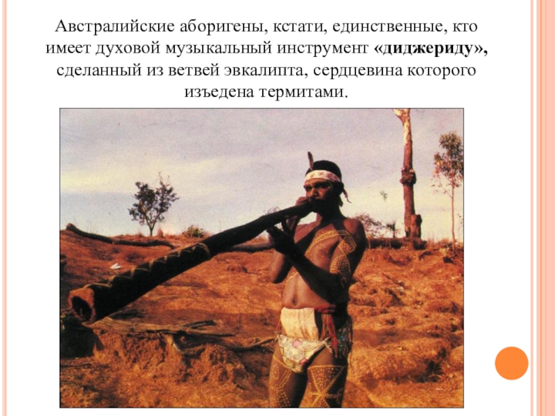 Слайд 24Австралийские аборигены, кстати, единственные, кто имеет духовой музыкальный инструмент «диджериду», сделанный