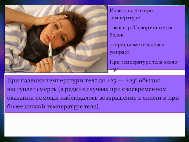 При падении температуры тела до +25 — +23° обычно наступает смерть (в редких случаях при своевременном оказании помощи наблюдалось возвращение к жизни и при более низкой температуре тела).