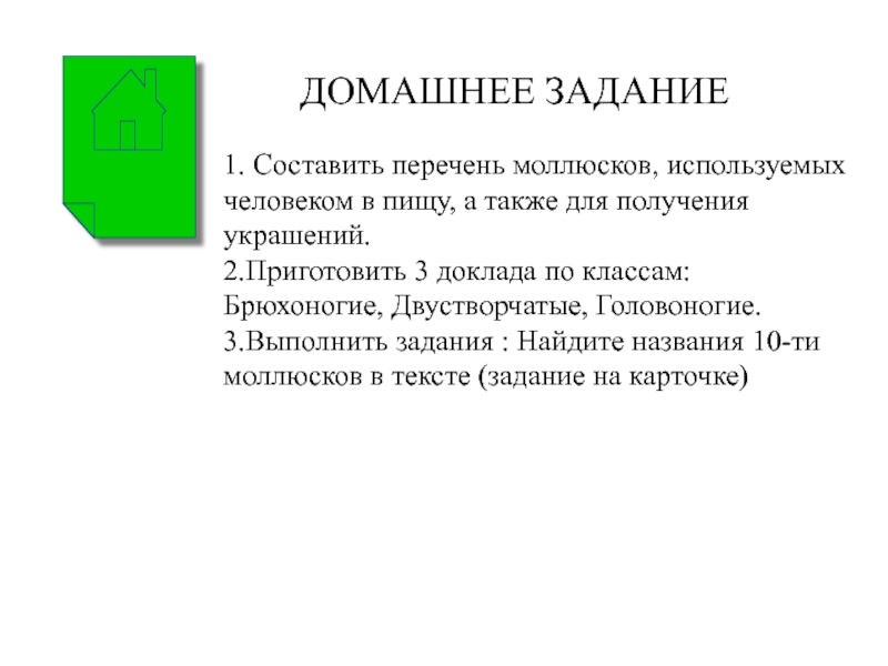 ДОМАШНЕЕ ЗАДАНИЕ1. Составить перечень моллюсков, используемых человеком в пищу, а также для получения украшений.