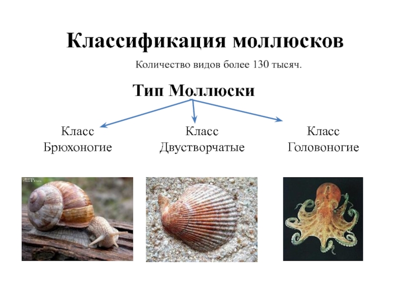 Классификация моллюсковКоличество видов более 130 тысяч.Тип МоллюскиКлассБрюхоногиеКлассДвустворчатыеКлассГоловоногие