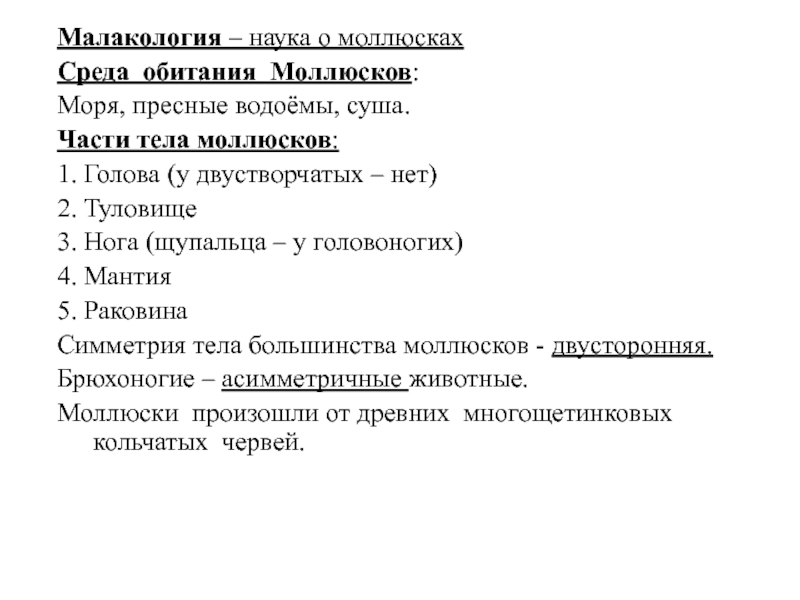 Малакология – наука о моллюскахСреда обитания Моллюсков:Моря, пресные водоёмы, суша.Части тела моллюсков:1. Голова (у двустворчатых – нет)2.