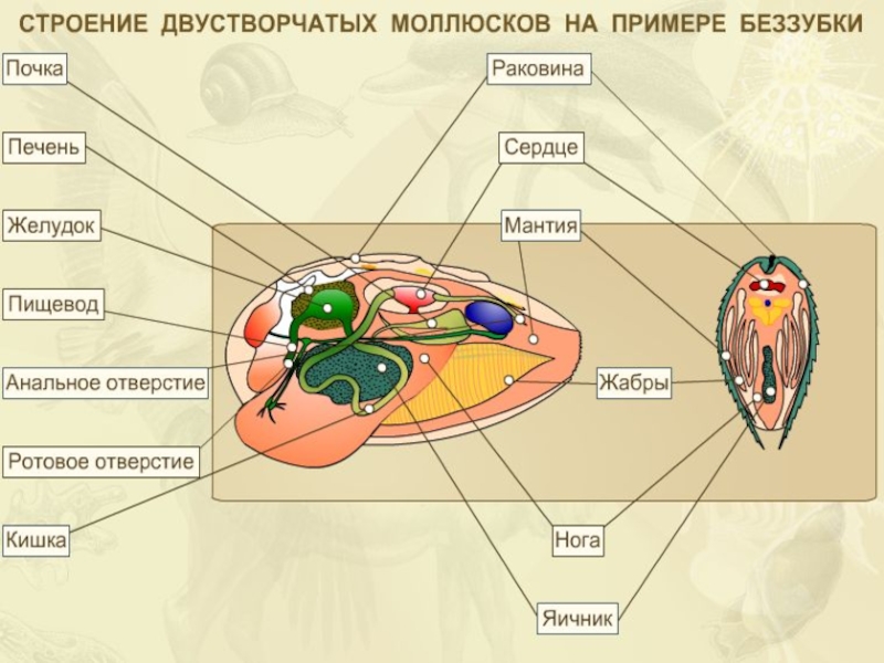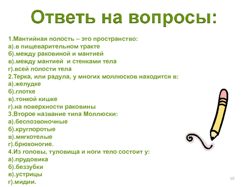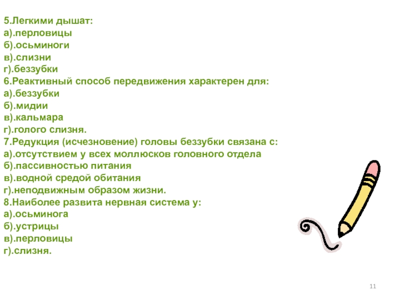 5.Легкими дышат:а).перловицыб).осьминогив).слизниг).беззубки6.Реактивный способ передвижения характерен для:а).беззубкиб).мидиив).кальмараг).голого слизня.7.Редукция (исчезновение) головы беззубки связана с:а).отсутствием у всех моллюсков головного отделаб).пассивностью