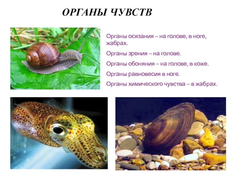 ОРГАНЫ ЧУВСТВОрганы осязания – на голове, в ноге, жабрах.Органы зрения – на голове.Органы обоняния – на голове,