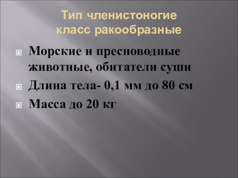 Тип членистоногие  класс ракообразные Морские и пресноводные животные, обитатели сушиДлина тела- 0,1 мм до 80 смМасса