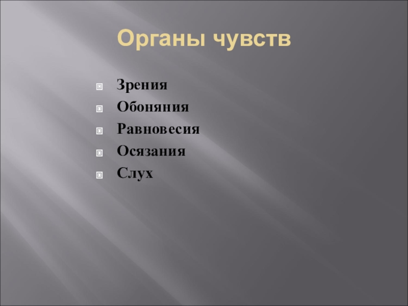 Органы чувствЗренияОбонянияРавновесияОсязанияСлух