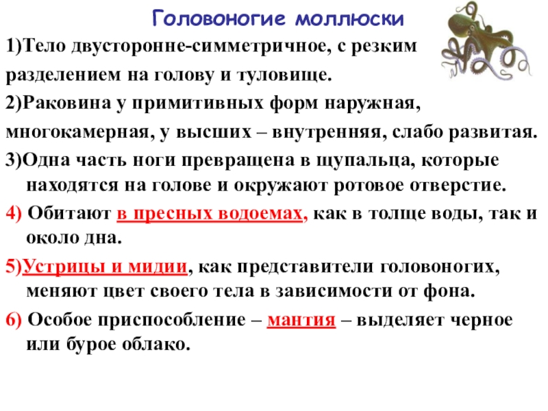 6) Особое приспособление – мантия – выделяет черное или бурое облако.